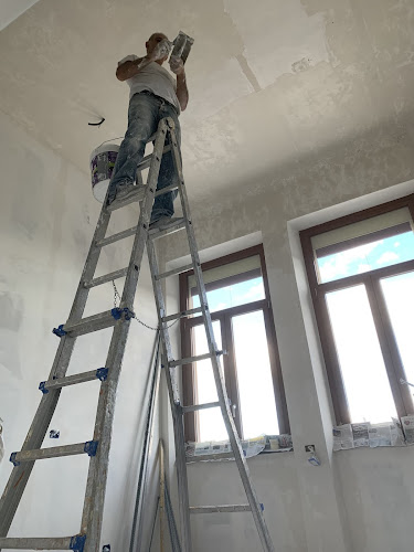 De stukadoors werken aan de 4.40 mtr hoge plafonds en ze gebruiken een steiger met smalle plankjes die los op ongeremde wielen staat.
